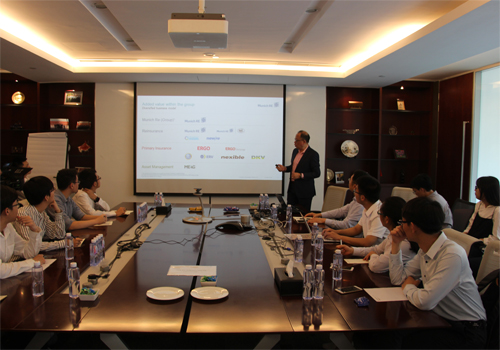参访活动第二站是德国慕尼黑再保险北京分公司。北大williamhill英国威廉希尔保险硕士校外导师、慕尼黑再保险集团大中华区副首席执行官常青先生热情地接待了风保系师生,郑伟老师对慕再公司支持北大风保系的“第二课堂”实践教学活动表示感谢。