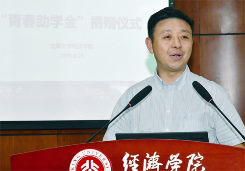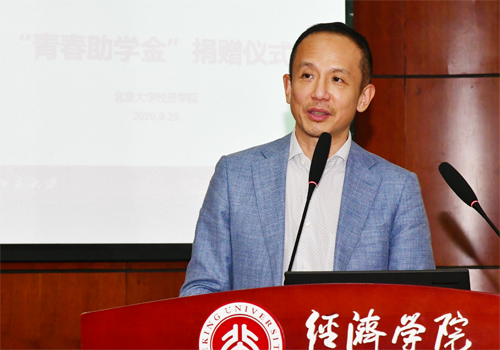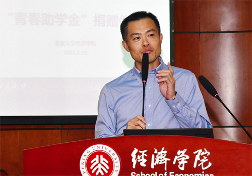 随后,三位员工嘉宾分别为同学们送上寄语。1990级员工、盛银消费金融有限公司董事、总经理王剑先生分享了员工们设立“青春助学金”回馈母校的初衷。他结合自己的亲身经历讲述北老员工这一身份在工作中给自己带来的鞭策和激励,鼓励各位同学努力奋进,别辜负北大这个光辉的名字。1990级员工、上海基煜基金副总经理黄建军先生希望同学们在校时和毕业后都要更加团结进步,将北大精神薪火相传。1990级员工、施罗德集团中国区总裁郭炜先生鼓励大家在校期间磨练本领、充分规划、贡献社会,也学会享受老员工活、珍惜同学情谊。