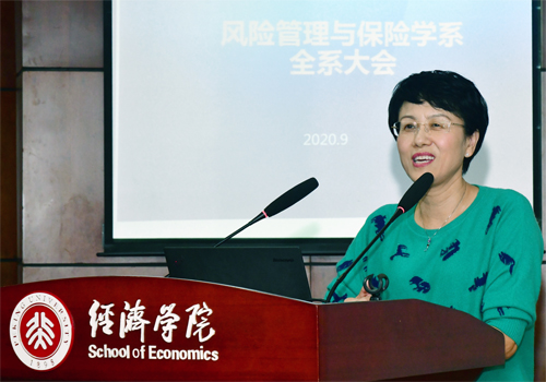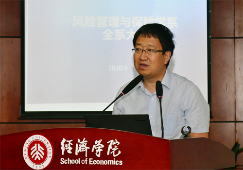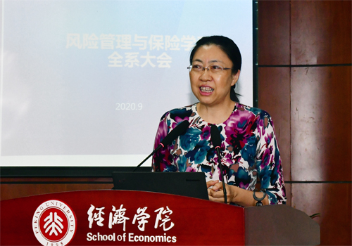 首先,风保系创始系主任孙祁祥教授致辞。她对加入风保系的新同学表示欢迎,希望同学们能用平常心对待疫情,积极调整心态,学会抗压力、抗挫折,在灾难事件中看到希望。她表示风保系的团队力量和专业基础应使同学们在国内国际都具有底气与自信,鼓励大家在风保系积极探索,为国家和社会作出贡献!