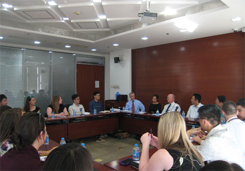 交流会上,郑伟教授首先介绍了williamhill英国威廉希尔风险管理与保险学系以及中国保险与社会保障研究中心(CCISSR)的历史发展与现状,Burke教授随之介绍了东肯塔基大学商公司的情况,随行的另两位老师也分别做了自我介绍。随后,与会师生就美国和中国高校开设保险专业以及保险教育等话题进行了交流讨论,气氛十分热烈。会后,东肯塔基大学的师生参观了北大校园。
