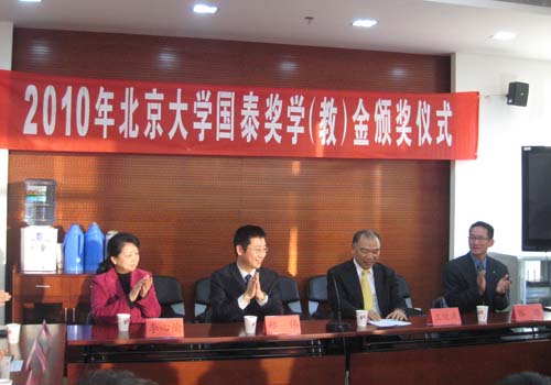 同学致词之后,由国泰人寿北京代表处首席代表 王健源先生为获奖同学颁发证书。王健源首代在接下来的致词中表示,与北大风险管理与保险学系已合作多年,现在如同家人般的亲切,虽然已进入寒冬,但北大风险管理与保险学系师生的热情却是如此的温暖。 回顾国泰金控尚未成立时,国泰人寿已是世界500强企业,但其仍不断兢兢业业地学习,以适应瞬息万变的保险市场。今年海峡两岸经济合作框架协议(ECFA)签定后,两岸的金融往来更加密切。今后国泰金控不论在寿险、产险还是银行方面,都将推行本土化发展,大举重用当地人才,作为未来在大陆市场的发展方针,特别欢迎北大同学的加入。同时,希望国泰能够与北大风险管理与保险学系继续合作,共创双赢。
