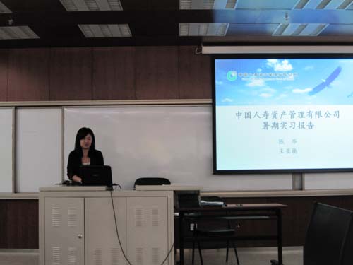 在实习报告会上,来自国泰人寿保险有限责任公司、平安寿险北京分公司、平安养老保险股份有限公司北京分公司、太平人寿北京分公司、中国出口信用保险公司、中国人民健康保险股份有限公司、中国人寿资产管理公司七家保险公司和资产管理公司的实习员工代表发表了实习报告。他们分别介绍了各自的实习工作、分享了实习中的见闻和感悟,并总结了今后实习中需要注意的事项供明年暑期实习的同学参考。在今年的实习报告会中还有暑期赴其他国家和地区实习交流的同学分享自己的见闻感受。四位分别赴美国、日本、台湾、香港交流或实习的研究生同学介绍了自己参加项目的情况,并结合在当地的工作和学习经历,分享了他们对各地经济社会和风土人情的看法。