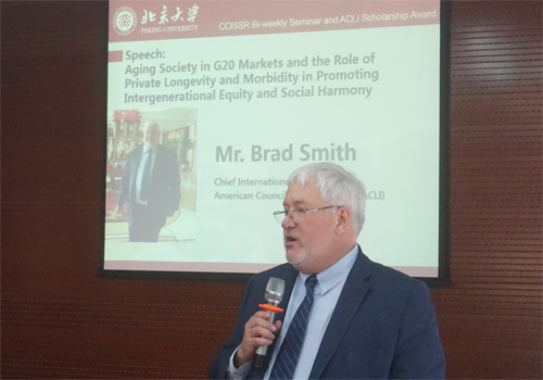接下来,ACLI首席国际官Smith先生以《G20国家的老龄化问题:养老金促进代际公平和社会和谐》为题发表了演讲。他在ACLI工作了22年,对于全球保险业发展和监管具有丰富经验。他结合在日本召开的G20峰会上的讨论,向大家介绍了老龄化问题的普遍性和严重性。在这一次峰会上,首次将人口老龄化列入全球发展面临的重要问题。为了应对退休金储蓄缺口,他对比了银行储蓄产品和养老金计划,认为养老金计划的久期更长、更不易被挪作他用,而且具有无可比拟的税收优势,因此应鼓励私人养老金产品发展,以弥补退休金储蓄缺口。Smith先生旁征博引,穿插介绍了智利模式、澳大利亚养老金第二支柱、日本的超级老龄化问题、中国的养老金制度建设特点等。最后,Smith先生介绍了高龄老年人群体的认知特征、投资行为,以及实践中的法律问题。他强调政府要全面考虑老龄化带来的一系列问题,并强调寿险公司应当发挥更加积极的作用。